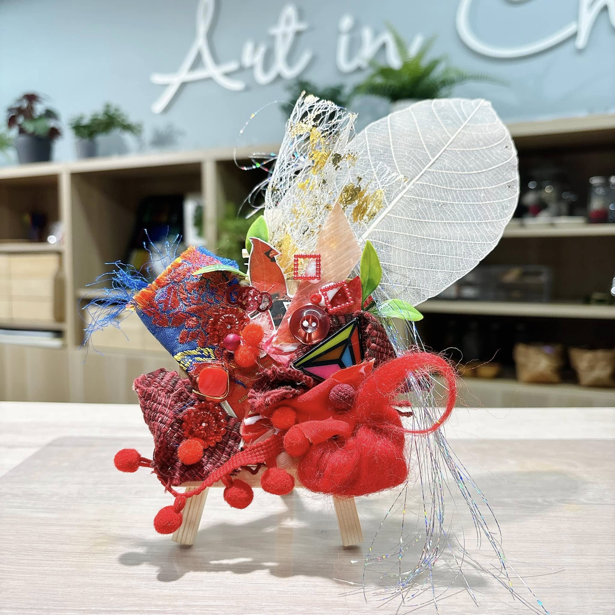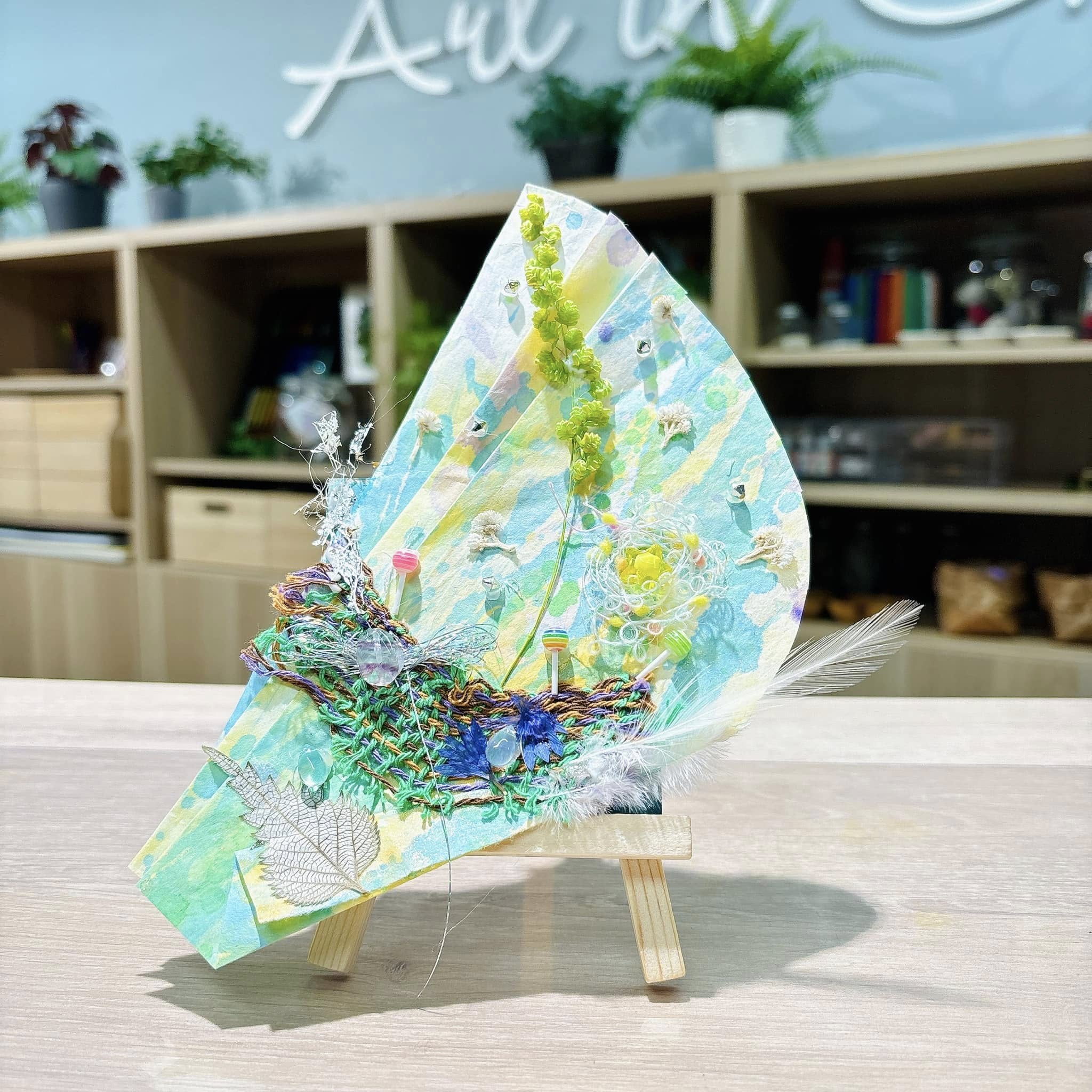 久しぶりに来れてとってもうれしかったです。わくわくする素材に、優しくよりそってくれるスタッフのみなさんのおかげで心がほぐれました。はじめは頭で考えて固まっていたイメージが手を動かしているうちにヒラメキがやってきて、自由にアートししっくりくるアートになりました。満足です!ありがとうございました。